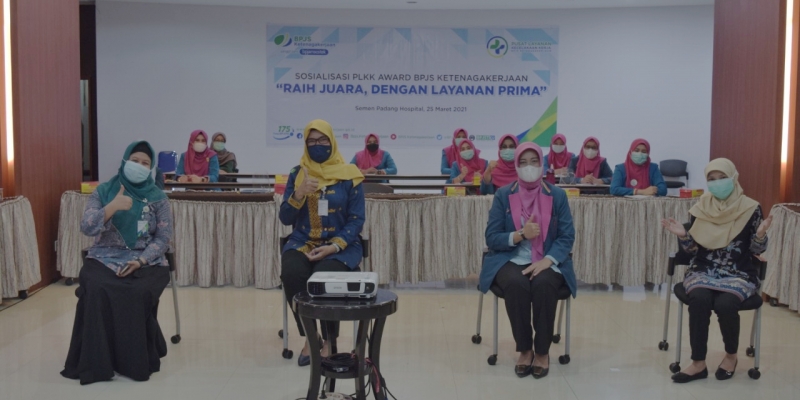 PADANG, 31/3/2021 - Dalam persiapan menghadapi PLKK Award, BPJS Ketenagakerjaan Cabang Padang menggelar sosialisasi PLKK Award bertemakan "Raih Juara, dengan Layanan Prima" bersama Semen Padang Hospital (SPH) di Padang, 25 Maret 2021 lalu.