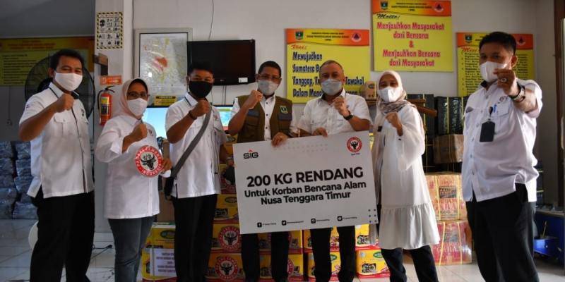 PADANG (15/4/2021) - PT Semen Padang melalui program Semen Padang Peduli menyalurkan bantuan rendang sebanyak 200 kilogram melalui Badan Penanggulangan Bencana Daerah (BPBD) Provinsi Sumatera Barat untuk korban bencana alam di Provinsi Nusa Tenggara Timur (NTT).
