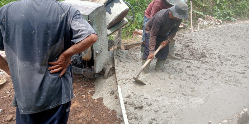 Dengan cangkul, sekop, dan ember di tangan, mereka bergotong royong mengecor jalan sepanjang lereng bukit yang membelah kawasan hutan rakyat itu. Suara adukan semen yang diaduk molen bercampur dengan tawa warga. Di tengah peluh dan debu, gotong royong terasa hidup. Setiap ember semen yang dituang menjadi simbol kebersamaan dan tekad memperbaiki akses kehidupan
