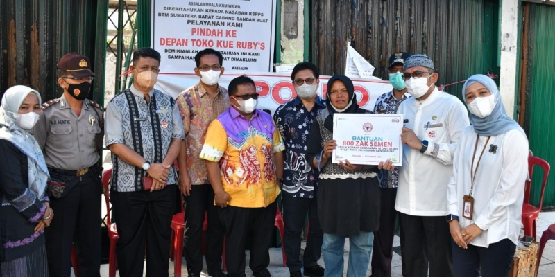 PADANG - PT Semen Padang menyerahkan bantuan semen sebanyak 800 zak kepada korban kebakaran 16 petak toko depan Pasar Pasar Bandar Buat, Lubuk Kilangan, Kota Padang.