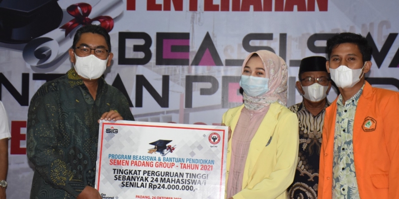 PADANG, (26/10/2021) - PT Semen Padang bersama Unit Pengumpul Zakat (UPZ) Baznas Semen Padang, menyalurkan bantuan beasiswa berprestasi sebesar Rp467.850 ribu kepada 738 pelajar, mahasiswa, dan atlet berprestasi, Selasa (26/10/2021).
