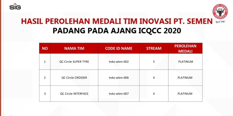 PADANG (3/12/2020) - Tim inovasi PT Semen Padang berhasil meraih tiga platinum pada ajang International Convention on Quality Control Circles (ICQCC) Dhaka, Bangladesh, yang digelar secara virtual dari tanggal 1-3 Desember 2020. Tiga penghargaan tertinggi di ajang internasional itu, masing-masing diraih oleh tim Crosser, tim Super Tyre dan tim Inter Face.